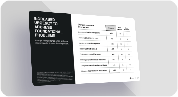 INCREASED URGENCY TO Change in importance More Less ADDRESS since last year Net change Important Important FOUNDATIONAL Improving our healthcare system +62 70 8 PROBLEMS Addressing povertyin this country +53 62 9 Change in importance since last year Improving our education system +53 62 9 (more important minus less important) Addressing climate change +51 61 10 Finding ways to combat fake news +50 60 10 Protecting people’s individual freedoms +50 59 9 Closing the economic and social divide +48 58 10 2021 Edelman Trust Barometer.IMP_POL_PRIORITIES. For each of Addressing discrimination and racism +42 53 11 the following issues and challenges, please indicate whether our country addressing it has become more important to you, less important to you, or has stayed the same in importance, since last year. 5-point scale; top 2 box; more important; bottom 2 box, less important. General population, 27-mkt avg. Net change is the difference between more and less important. 17