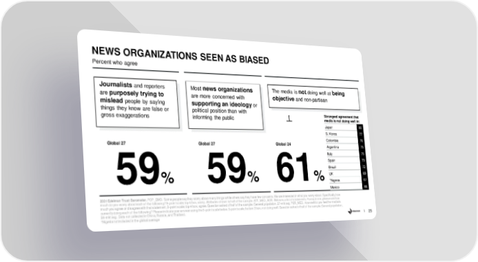 NEWS ORGANIZATIONS SEEN AS BIASED Percent who agree Journalists and reporters Most news organizations The media is notdoing well at being are purposely trying to are more concerned with objective and non-partisan mislead people by saying supporting an ideology or things they know are false or political position than with Strongest agreement that gross exaggerations informing the public media is not doing well in: Japan 80 S. Korea 77 Global 27 Global 27 Global 24 Colombia 76 Argentina 75 Italy 75 Spain 73 Brazil 72 59% 59% 61%UK 69 *Nigeria 67 Mexico 66 2021 Edelman Trust Barometer.POP_EMO. Some people say they worry about many things while others say they have few concerns. We are interested in what you worry about. Specifically, how much do you worry about each of the following? 9-point scale; top 4 box, worry. Attributes shown to half of the sample. ATT_MED_AGR. Below is a list of statements. For each one, please rate how much you agree or disagree with that statement. 9-point scale; top 4 box, agree. Question asked of half of the sample. General population, 27-mkt avg. PER_MED. How well do you feel the media is currently doing each of the following? Please indicate your answer using the 5-point scale below. 5-point scale; bottom 3 box, not doing well. Question asked of half of the sample. General population, 24-mkt avg. Data not collected in China, Russia, and Thailand. *Nigeria not included in the global average 25