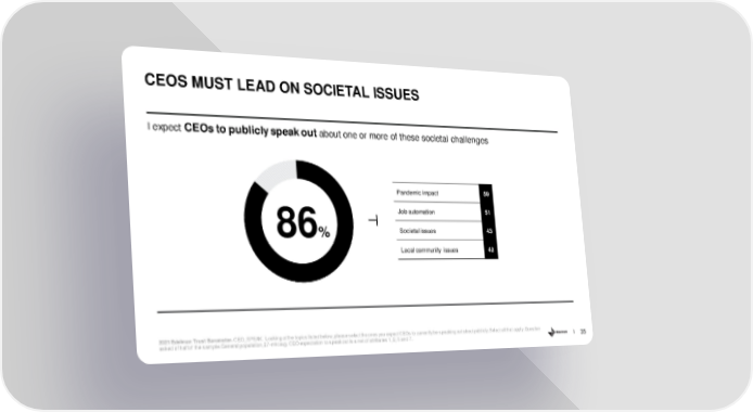 CEOS MUST LEAD ON SOCIETAL ISSUES I expect CEOs to publicly speak out about one or more of these societal challenges Pandemic impact 59 Job automation 51 86% Societal issues 43 Local community issues 40 2021 Edelman Trust Barometer.CEO_SPEAK. Looking at the topics listed below, please select the ones you expect CEOs to currently be speaking out about publicly.Select all that apply. Question asked of half of the sample. General population, 27-mkt avg. CEO expectation to speak out is a net of attributes 1, 2, 5 and 7. 35