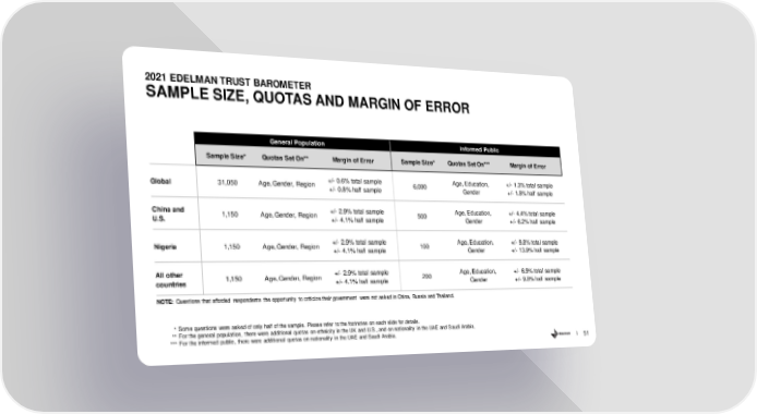 2021 EDELMAN TRUST BAROMETER SAMPLE SIZE, QUOTAS AND MARGIN OF ERROR General Population Informed Public Sample Size* Quotas Set On** Margin of Error Sample Size* Quotas Set On*** Margin of Error Global 31,050 Age, Gender, Region +/- 0.6% total sample 6,000 Age, Education, +/- 1.3% total sample +/- 0.8% half sample Gender +/- 1.8% half sample China and 1,150 Age, Gender, Region +/- 2.9% total sample 500 Age, Education, +/- 4.4% total sample U.S. +/- 4.1% half sample Gender +/- 6.2% half sample Nigeria 1,150 Age, Gender, Region +/- 2.9% total sample 100 Age, Education, +/- 9.8% total sample +/- 4.1% half sample Gender +/- 13.9% half sample All other 1,150 Age, Gender, Region +/- 2.9% total sample 200 Age, Education, +/- 6.9% total sample countries +/- 4.1% half sample Gender +/- 9.8% half sample NOTE: Questions that afforded respondents the opportunity to criticize their government were not asked in China, Russia and Thailand. * Some questions were asked of only half of the sample. Please refer to the footnotes on each slide for details. ** For the general population, there were additional quotas on ethnicity in the UK and U.S., and on nationality in the UAE and Saudi Arabia. *** For the informed public, there were additional quotas on nationality in the UAE and Saudi Arabia. 51