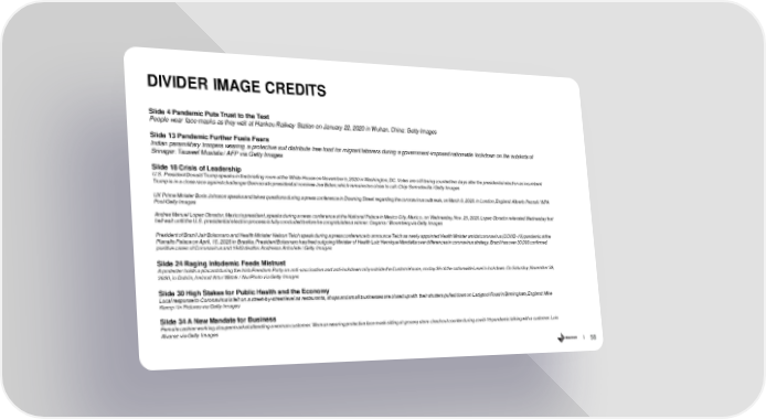 DIVIDER IMAGE CREDITS Slide 4 Pandemic Puts Trust to the Test People wear face masks as they wait at Hankou Railway Station on January 22, 2020 in Wuhan, China: Getty Images Slide 13 Pandemic Further Fuels Fears Indian paramilitary troopers wearing a protective suit distribute free food for migrant laborers during a government-imposed nationwide lockdown on the outskirts of Srinagar: Tauseef Mustafa / AFP via Getty Images Slide 18 Crisis of Leadership U.S. President Donald Trump speaks in the briefing room at the White House on November 5, 2020 in Washington, DC. Votes are still being counted two days after the presidential election as incumbent Trump is in a close race against challenger Democratic presidential nominee Joe Biden, which remains too close to call: Chip Somodevilla/ Getty Images UK Prime Minister Boris Johnson speaks and takes questions during a press conference in Downing Street regarding the coronavirusoutbreak, on March 9, 2020. in London, England: Alberto Pezzali/ WPA Pool/Getty Images Andres Manuel Lopez Obrador, Mexico's president, speaks during a news conference at the National Palace in Mexico City, Mexico, on Wednesday, Nov. 25, 2020. Lopez Obradorreiterated Wednesday that hell wait until the U.S. presidential election process is fully concluded before he congratulates a winner: Cegarra/ Bloomberg via Getty Images President of Brazil Jair Bolsonaro and Health Minister Nelson Teich speak during a press conference to announce Teichas newly appointed Health Minister amidst coronavirus (COVID-19) pandemic at the PlanaltoPalace on April, 16, 2020 in Brasilia. President Bolsonaro has fired outgoing Minister of Health Luiz Henrique Mandettaover differences in coronavirus strategy. Brazil has over 30,000 confirmed positive cases of Coronavirus and 1942 deaths: Andressa Anholete/ Getty Images Slide 24 Raging Infodemic Feeds Mistrust A protester holds a placard during the Irish Freedom Party an anti-vaccination and anti-lockdown rally outside the Custom House,on day 39 of the nationwide Level 5 lockdown. On Saturday, November 28, 2020, in Dublin, Ireland: Artur Widak / NurPhotovia Getty Images Slide 30 High Stakes for Public Health and the Economy Local response to Coronavirus is felt on a street-by-street level as restaurants, shops and small businesses are closed up with their shutters pulled down on LadypoolRoad in Birmingham, England: Mike Kemp / In Pictures via Getty Images Slide 34 A New Mandate for Business Female cashier working at supermarket attending a woman customer. Woman wearing protective face mask sitting at grocery store checkout counter during covid-19 pandemic talking with a customer. Luis Alvarez via Getty Images 58