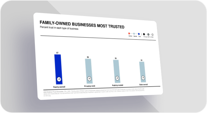 FAMILY-OWNED BUSINESSES MOST TRUSTED Percent trust in each type of business - 0 + Distrust Neutral Trust Change, 2021 to 2022 67 58 56 52 +3 +3 +3 +2 Family-owned Privately-held Publicly-traded State-owned 2022 Edelman Trust Barometer. TRU_ORG. Thinking about different types of businesses, please indicate how much you trust each type of business to do what is right using a 9-point scale where one means that you “do not trust them at all” and nine means that you “trust them a great deal”. 9-point scale; top 4 box, trust. Question asked of half of the sample. General population, 27-mkt avg.