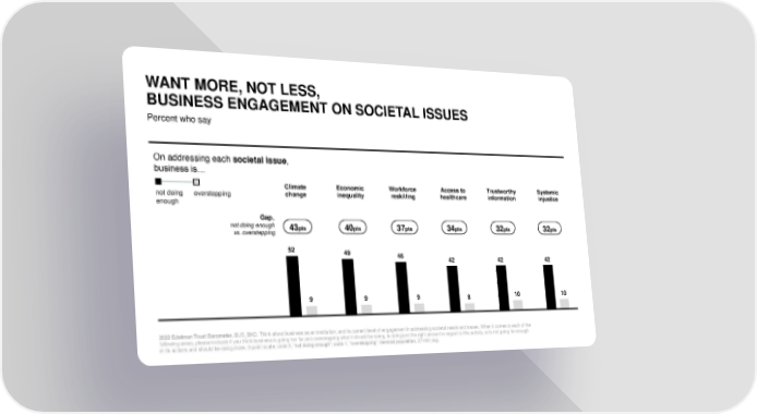 WANT MORE, NOT LESS, BUSINESS ENGAGEMENT ON SOCIETAL ISSUES Percent who say On addressing each societal issue, business is… Climate Economic Workforce Access to Trustworthy Systemic not doing overstepping change inequality reskilling healthcare information injustice enough Gap, not doing enough 43pts 40pts 37pts 34pts 32pts 32pts vs. overstepping 52 49 46 42 42 42 9 9 9 8 10 10 2022 Edelman Trust Barometer. BUS_BND. Think about business as an institution, and its current level of engagement in addressing societal needs and issues. When it comes to each of the following areas, please indicate if you think business is going too far and overstepping what it should be doing, is doing just the right amount in regard to this activity, or is not going far enough in its actions and should be doing more. 3-point scale; code 3, “not doing enough”; code 1, “overstepping”. General population, 27-mkt avg.