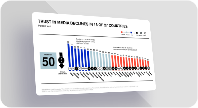 TRUST IN MEDIA DECLINES IN 15 OF 27 COUNTRIES Percent trust - 0 + Distrust Neutral Trust Change, 2021 to 2022 Trusted in 7 of 28 countries; 80 Double-digit gains in China, 73 UAE rises to trust 66 66 64 64 Distrusted in 14 of 28 countries; 60 59 58 57 Australia and Germany fall into distrust 54 52 51 50 Global 27 47 47 45 43 43 41 40 39 38 38 -1 35 35 33 29 50 pt +10 +1 -3 +5 +4 +8 -2 -3 -3 +2 +1 -2 n/a 0 -1 -5 +3 +1 -8 -1 -2 -6 -1 +1 -1 -2 -7 0 Change, 2021 to 2022 2022 Edelman Trust Barometer. TRU_INS. [Media in general] Below is a list of institutions. For each one, please indicate how much you trust that institution to do what is right. 9-point scale; top 4 box, trust. General population, 27-mkt avg. *Nigeria is not included in the global average