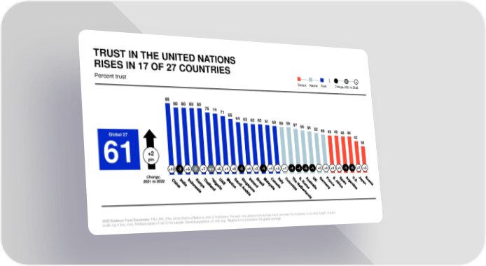 TRUST IN THE UNITED NATIONS RISES IN 17 OF 27 COUNTRIES - 0 + Percent trust Distrust Neutral Trust Change, 2021 to 2022 85 80 80 80 80 75 74 71 68 64 63 62 62 61 60 59 59 57 55 54 52 50 49 49 48 48 Global 27 42 35 +2 61 pts +12 -2 +6 0 +7 n/a +6 +1 +8 -3 +4 +2 -1 +4 +5 +1 -1 -4 -5 -1 +4 +4 +1 +1 -1 -6 +7 +3 Change, 2021 to 2022 2022 Edelman Trust Barometer. TRU_INS. [The United Nations] Below is a list of institutions. For each one, please indicate how much you trust that institution to do what is right. 9-point scale; top 4 box, trust. Attribute asked of half of the sample. General population, 27-mkt avg. *Nigeria is not included in the global average