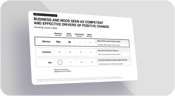 GLOBAL 24 Not asked in China, Russia, Thailand BUSINESS AND NGOSSEEN AS COMPETENT AND EFFECTIVE DRIVERS OF POSITIVE CHANGE Net ethical scores in detail Business NGOs Government Media Net score Net score Net score Net score Highly effective agent of positive change Effective pts -7 9 vs 29 30 Completely ineffective agent of positive change Has vision for the future I believe in Visionary 19 22 -10 -5 vs Does not have a vision for the future I believe in Serves the interests of everyone equally and fairly Fair -7 11 -19 -12 vs Serve the interests of only certain groups of people Watchout for business: negative score for fairness 2022 Edelman Trust Barometer. [INS]_PER_DIM. In thinking about why you do or do not trust [institution], please specify where you think they fall on the scale between the two opposing descriptions. 11-point scale; top 5 box, positive; bottom 5 box, negative. Questions asked of half of the sample. General population, 24-mkt avg. Data not collected in China, Russia and Thailand.