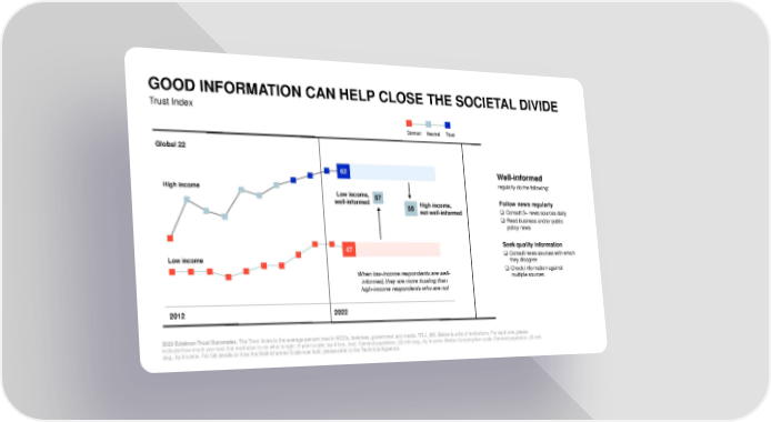 GOOD INFORMATION CAN HELP CLOSE THE SOCIETAL DIVIDE Trust Index Distrust Neutral Trust Global 22 62 Well-informed High income regularly do the following: Low income, 57 Follow news regularly well-informed 55 High income, not well-informed ❑Consult 3+ news sources daily ❑Read business and/or public policy news 47 Seek quality information ❑Consult news sources with which Low income they disagree When low-income respondents are well- ❑Check information against informed, they are more trusting than multiple sources high-income respondents who are not 2012 2022 2022 Edelman Trust Barometer. The Trust Index is the average percent trust in NGOs, business, government and media. TRU_INS. Below is a list of institutions. For each one, please indicate how much you trust that institution to do what is right. 9-point scale; top 4 box, trust. General population, 22-mkt avg., by income. Media Consumption scale. General population, 22-mkt avg., by income. For full details on how the Well-Informed Scale was built, please refer to the Technical Appendix.