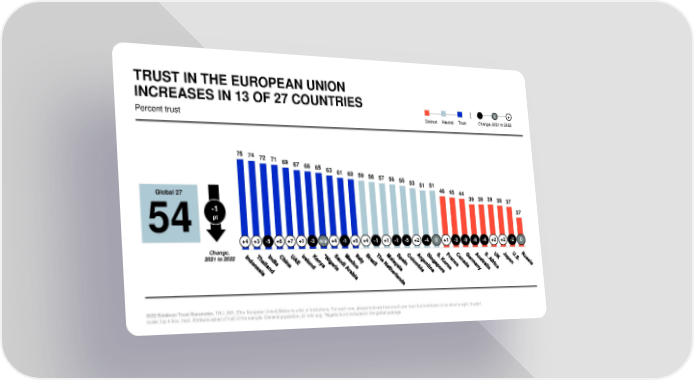 TRUST IN THE EUROPEAN UNION INCREASES IN 13 OF 27 COUNTRIES - 0 + Percent trust Distrust Neutral Trust Change, 2021 to 2022 75 74 72 71 69 67 66 65 63 61 60 59 58 57 56 55 53 51 51 46 Global 27 45 44 39 39 39 38 37 -1 27 54 pt +4 +3 -5 +6 +7 +1 -3 n/a +4 -1 +5 +4 -1 +1 -1 -5 +2 -4 0 +1 -3 -9 -6 -4 +2 +2 -2 0 Change, 2021 to 2022 2022 Edelman Trust Barometer. TRU_INS. [The European Union] Below is a list of institutions. For each one, please indicate how much you trust that institution to do what is right. 9-point scale; top 4 box, trust. Attribute asked of half of the sample. General population, 27-mkt avg. *Nigeria is not included in the global average