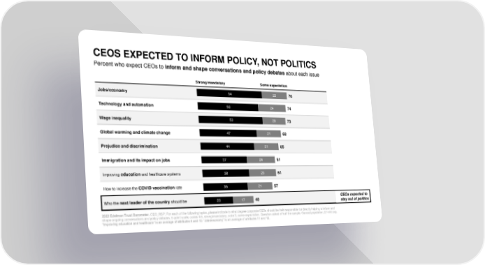 CEOS EXPECTED TO INFORM POLICY, NOT POLITICS Percent who expect CEOs to inform and shape conversations and policy debates about each issue Strong/mandatory Some expectation Jobs/economy 54 22 76 Technology and automation 50 24 74 Wage inequality 53 20 73 Global warming and climate change 47 21 68 Prejudice and discrimination 44 21 65 Immigration and its impact on jobs 37 24 61 Improving education and healthcare systems 38 23 61 COVID vaccination 36 21 How to increase the rate 57 next leader of the country CEOs expected to Who the should be 23 17 40 stay out of politics 2022 Edelman Trust Barometer. CEO_RSP. For each of the following topics, please indicate to what degree corporate CEOs should be held responsible for directly helping to inform and shape ongoing conversations and policy debates. 5-point scale; codes 4-5, strong/mandatory; code 3, some expectation. Question asked of half the sample. General population, 27-mkt avg. “Improving education and healthcare” is an average of attributes 9 and 10. “Jobs/economy” is an average of attributes 11 and 12.