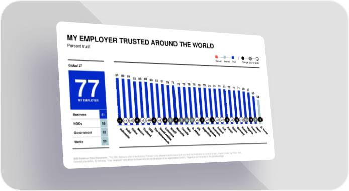 MY EMPLOYER TRUSTED AROUND THE WORLD Percent trust - 0 + Distrust Neutral Trust Change, 2021 to 2022 Global 27 91 90 89 85 85 85 83 82 81 79 79 76 76 76 76 75 75 74 74 74 73 72 71 71 69 67 76% 60 77 53 MY EMPLOYER My employer more trusted than institutions Business 61 NGOs 59 -1 +1 +15 -1 +2 +10 -2 +3 -1 0 -4 0 0 0 +5 -2 +2 -4 +2 +2 -6 +3 -5 +5 n/a -3 0 -5 Government 52 Media 50 2022 Edelman Trust Barometer. TRU_INS. Below is a list of institutions. For each one, please indicate how much you trust that institution to do what is right. 9-point scale; top 4 box, trust. General population, 27-mkt avg. “Your employer” only shown to those who are an employee of an organization (Q43/1). *Nigeria is not included in the global average