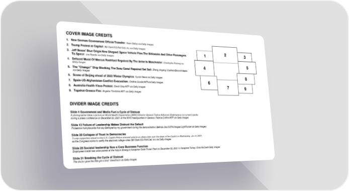 COVER IMAGE CREDITS 1. New German Government Official Transfer: Sean Gallup via Getty Images 2. Trump Protest at Capitol: Bill Clark/CQ-Roll Call, Inc via Getty Images 2 3 3. Jeff Bezos' Blue Origin New Shepard Space Vehicle Flies The Billionaire And Other Passengers 1 To Space: Joe Raedlevia Getty Images 4. Defaced Mural Of Marcus Rashford Repaired By The Artist In Manchester: Christopher Furlong via 5 Getty Images 4 5. The "Changci" Ship Blocking The Suez Canal Repaired Set Sail: Zhang Jingang/ Costfoto/Barcroft Media via Getty Images 8 6. Scene of Beijing ahead of 2022 Winter Olympics: Kyodo News vis Getty Images 7. Spain-US-Afghanistan-Conflict-Evacuation: Cristina Quicler/AFPviaGetty Images 6 8. Australia-Health-Virus-Protest: David Gray/AFP via Getty Images 7 9 9. Topshot-Greece-Fire: AngelosTzortzinis/AFP via Getty Images DIVIDER IMAGE CREDITS Slide 4 Government and Media Fuel a Cycle of Distrust A photographer takes a picture as World Health Organization (WHO) Director-General Tedros Adhanom Ghebreyesus (on screen) speaks during a press conference on December 20, 2021 at the WHO headquarters in Geneva: Fabrice Coffrini/AFP via Getty Images Slide 13 Failure of Leadership Makes Distrust the Default Protestors hold placards that say Betrayed by my government during the demonstration: Belinda Jiao/SOPA Images/LightRocket via Getty Images) Slide 20 Collapse of Trust in Democracies Trump supporters stand on the U.S. Capitol Police armored vehicle as others take over the steps of the Capitol on Wednesday, Jan. 6, 2021, as the Congress works to certify the electoral college votes: Bill Clark/CQ-Roll Call, Inc via Getty Images Slide 25 Societal leadership Now a Core Business Function Employees install new solar panels at the Kalyon Energy's Karapinar Solar Power Plant on December 02, 2021 in Karapinar,Turkey: Chris McGrath/Getty Images Slide 31 Breaking the Cycle of Distrust The doctor gave the little girl a shot: ViewStock via Getty Images