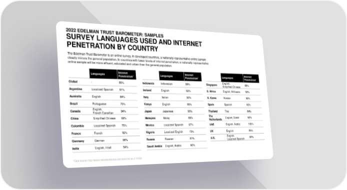 2022 EDELMAN TRUST BAROMETER: SAMPLES SURVEY LANGUAGES USED AND INTERNET PENETRATION BY COUNTRY The Edelman Trust Barometer is an online survey. In developed countries, a nationally-representative online sample closely mirrors the general population. In countries with lower levels of internet penetration, a nationally-representative online sample will be more affluent, educated and urban than the general population. Languages Internet Languages Internet Languages Internet Penetration* Penetration* Penetration* Global - 85% Indonesia Indonesian 89% Singapore English, 88% Simplified Chinese Argentina Localized Spanish 91% Ireland English 92% S. Africa English, Afrikaans 58% Australia English 84% Italy Italian 93% S. Korea Korean 96% Brazil Portuguese 75% Kenya English 85% Spain Spanish 93% Canada English, 94% Japan Japanese 95% Thailand Thai 84% French Canadian China Simplified Chinese 69% Malaysia Malay 89% The English, Dutch 96% Netherlands Colombia Localized Spanish 75% Mexico Localized Spanish 67% UAE English, Arabic 100% France French 92% Nigeria Localized English 73% UK English 95% Germany German 96% Russia Russian 81% U.S. English, 90% Localized Spanish India English, Hindi 54% Saudi Arabia English, Arabic 90% *Data source: http://www.internetworldstats.com/stats.htm as of 1/3/22