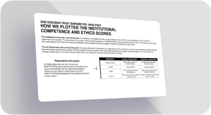 2022 EDELMAN TRUST BAROMETER: ANALYSES HOW WE PLOTTED THE INSTITUTIONAL COMPETENCE AND ETHICS SCORES The competence score (the x-axis of the plot): An institution’s competence score is a net of the top 3 box (AGREE) minus the bottom 3 box (DISAGREE) responses to the question “To what extent do you agree with the following statement? [INSTITUTION] in general is good at what it does”. The resulting net score was then subtracted by 50 so that the dividing line between more competent and less competent institutions crossed the y-axis at zero. The net ethical score (the y-axis of the plot): The ethics dimension is defined by four separate items. For each item, a net score was calculated by taking the top 5 box percentage representing a positive ethical perception minus the bottom 5 box percentage representing a negative ethical perception. The y-axis value is an average across those 4 net scores. Scores higher than zero indicate an institution that is perceived as ethical. DIMENSION ETHICAL PERCEPTION UNETHICAL PERCEPTION Respondents were asked: Purpose-Driven Highly effective agent of Completely ineffective agent In thinking about why you do or do not trust positive change of positive change [INSTITUTION], please specify where you think they fall Honest Honest and fair Corrupt and biased on the scale between the two opposing descriptions. (Please use the slider to indicate where you think Vision Has a vision for the future Does not have a vision for the [INSTITUTION] falls between the two extreme end points that I believe in future that I believe in of each scale.) Fairness Serves the interests of everyone Serves the interests of only certain equally and fairly groups of people
