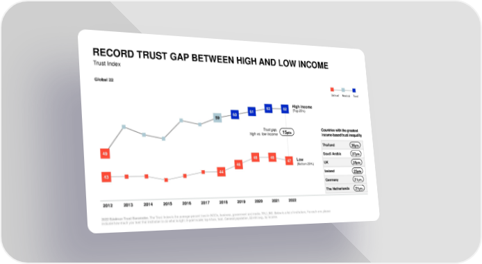 RECORD TRUST GAP BETWEEN HIGH AND LOW INCOME Trust Index Global 22 Distrust Neutral Trust 62 62 High income 61 (Top 25%) 59 60 Trust gap, 15pts Countries with the greatest high vs. low income income-based trust inequality Thailand 36pts 49 48 48 Saudi Arabia 27pts 47 Low UK 25pts 46 (Bottom 25%) 43 44 Ireland 23pts Germany 21pts The Netherlands 21pts 2012 2013 2014 2015 2016 2017 2018 2019 2020 2021 2022 2022 Edelman Trust Barometer. The Trust Index is the average percent trust in NGOs, business, government and media. TRU_INS. Below is a list of institutions. For each one, please indicate how much you trust that institution to do what is right. 9-point scale; top 4 box, trust. General population, 22-mkt avg., by income.