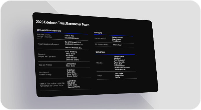 2023 Edelman Trust Barometer Team EDELMAN TRUST INSTITUTE ADVISORS Executive Director, Tonia E. Ries Richard Edelman Thought Leadership [email protected] Executive Advisors Kirsty Graham Dave Samson David M. Bersoff, Ph.D. DXI Research Advisor Antoine Harary Thought Leadership Research [email protected] Theresa Peterson, M.A. Cody Armstrong MARKETING Research Abbey Derse Analysis and Operations Rosie Delk Vanessa Pymble Claire Ritzmann Mike Bush Catherine Aumiller Polly Mingledorff Marketing Ryann Gastwirth Data and Analytics John Zamites Kayley Goff Kiera Cooke Pamela Blandon Heather Daniels-Gontier Drake Baer Romain Maradan Narrative and Esther Choi Content Strategy Chloe Buckley John Plecha Brooke Walker Design Megan Gilbert Han Xu Justin Blake Edelman Trust Institute Leadership, Ellie Smith Partnerships and Content Teams Caitlin Semo Susannah Ferris