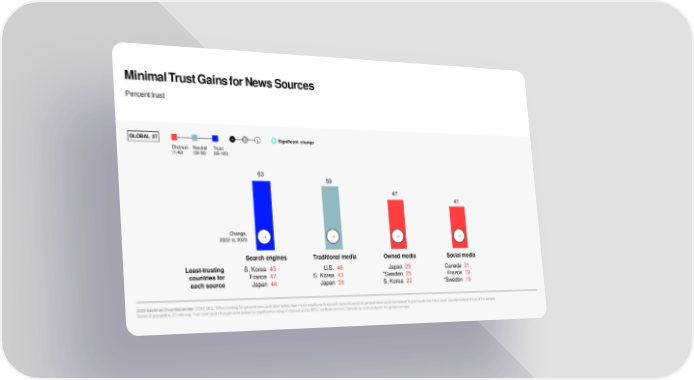 Minimal Trust Gains for News Sources Percent trust GLOBAL 27 - 0 + Significant change Distrust Neutral Trust (1-49) (50-59) (60-100) 63 59 47 41 Change, +1 +1 +1 +1 2022 to 2023 Search engines Traditional media Owned media Social media Least-trusting S. Korea 49 U.S. 48 Japan 29 Canada 21 countries for France 47 S. Korea 43 *Sweden 25 France 19 each source Japan 44 Japan 39 S. Korea 22 *Sweden 19 2023 Edelman Trust Barometer. COM_MCL. When looking for general news and information, how much would you trust each type of source for general news and information? 9-point scale; top 4 box, trust. Question asked of half of the sample. General population, 27-mkt avg. Year-over-year changes were tested for significance using a t-test set at the 99%+ confidence level. *Sweden is not included in the global average.