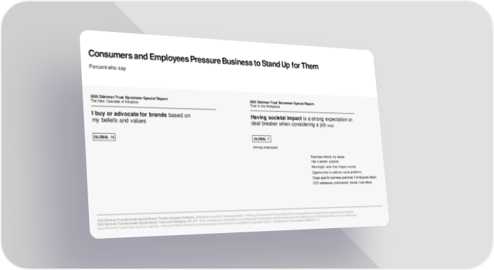 Consumers and Employees Pressure Business to Stand Up for Them Percent who say 2022 Edelman Trust Barometer Special Report: 2022 Edelman Trust Barometer Special Report: The New Cascade of Influence Trust In the Workplace I buy or advocate for brands based on Having societal impact is a strong expectation or my beliefs and values deal breaker when considering a job (avg) GLOBAL 14 GLOBAL 7 Among employees Business reflects my values Has a greater purpose Meaningful work that shapes society Opportunities to address social problems Stops specific business practices if employees object CEO addresses controversial issues I care about 2022 Edelman Trust Barometer Special Report: The New Cascade of Influence. Belief-driven consumers. General population, 14-mkt avg. Please see the Technical Appendix for full explanation of how belief-driven consumers were measured. 2022 Edelman Trust Barometer Special Report: Trust in the Workplace. EMP_IMP. When considering an organization as a potential place of employment, how important is each of the following to you in deciding whether or not you would accept a job offer there? 3-point scale; top 2 box, important. 7-mkt avg. All data is filtered to be among employees who work for an organization or corporation (Q43/1). “Societal impact” is an average of attributes 12-17.