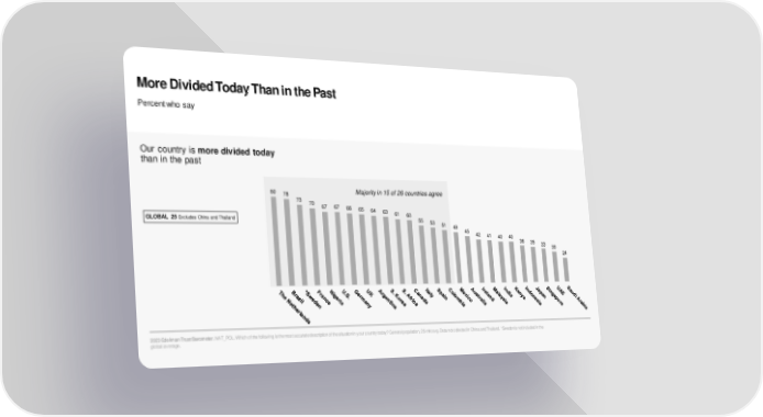 More Divided Today Than in the Past Percent who say Our country is more divided today than in the past 80 78 Majority in 15 of 26 countries agree 73 70 67 67 66 65 64 63 GLOBAL 25 Excludes China and Thailand 61 60 55 53 51 49 45 42 41 40 40 36 35 33 30 24 2023 Edelman Trust Barometer. NAT_POL. Which of the following is the most accurate description of the situation in your country today? General population, 25-mkt avg. Data not collected in China and Thailand. *Sweden is not included in the global average.