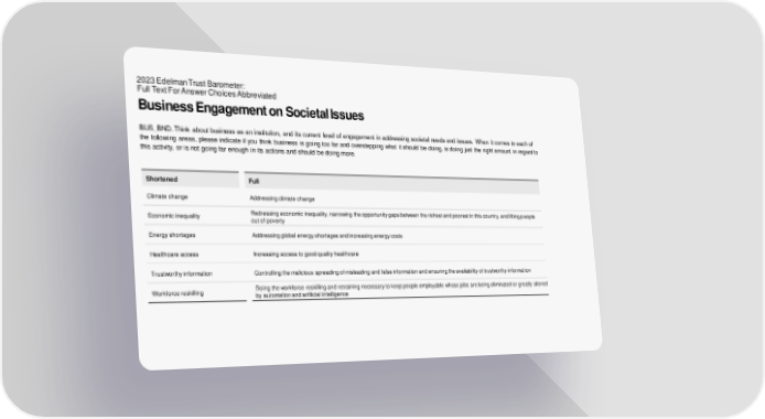 2023 Edelman Trust Barometer: Full Text For Answer Choices Abbreviated Business Engagement on Societal Issues BUS_BND. Think about business as an institution, and its current level of engagement in addressing societal needs and issues. When it comes to each of the following areas, please indicate if you think business is going too far and overstepping what it should be doing, is doing just the right amount in regard to this activity, or is not going far enough in its actions and should be doing more. Shortened Full Climate change Addressing climate change Economic inequality Redressing economic inequality, narrowing the opportunity gaps between the richest and poorest in this country, and lifting people out of poverty Energy shortages Addressing global energy shortages and increasing energy costs Healthcare access Increasing access to good quality healthcare Trustworthy information Controlling the malicious spreading of misleading and false information and ensuring the availability of trustworthy information Workforce reskilling Doing the workforce reskilling and retraining necessary to keep people employable whose jobs are being eliminated or greatly altered by automation and artificial intelligence