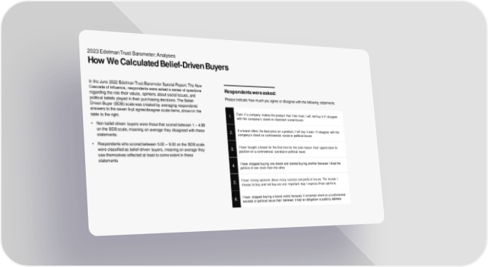 2023 Edelman Trust Barometer: Analyses How We Calculated Belief-Driven Buyers In the June 2022 Edelman Trust Barometer Special Report: The New Cascade of Influence, respondents were asked a series of questions Respondents were asked: regarding the role their values, opinions about social issues, and Please indicate how much you agree or disagree with the following statements political beliefs played in their purchasing decisions. The Belief- Driven Buyer (BDB) scale was created by averaging respondents’ answers to the seven 9-pt agree/disagree scale items, shown in the 1. Even if a company makes the product that I like most, I will not buy it if I disagree table to the right. with the company’s stand on important social issues • Non-belief-driven buyers were those that scored between 1 – 4.99 on the BDB scale, meaning on average they disagreed with these 2. If a brand offers the best price on a product, I will buy it even if I disagree with the statements. company’s stand on controversial social or political issues • Respondents who scored between 5.00 – 9.00 on the BDB scale I have bought a brand for the first time for the sole reason that I appreciated its were classified as belief-driven buyers, meaning on average they 3. position on a controversial societal or political issue saw themselves reflected at least to some extent in these statements I have stopped buying one brand and started buying another because I liked the 4. politics of one more than the other 5. I have strong opinions about many societal and political issues. The brands I choose to buy and not buy are one important way I express those opinions. 6. I have stopped buying a brand solely because it remained silent on a controversial societal or political issue that I believed it had an obligation to publicly address