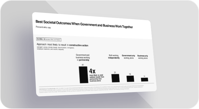 Best Societal Outcomes When Government and Business Work Together Percent who say GLOBAL 25 Excludes China and Thailand Approach most likely to result in constructive action averaged across climate change, discrimination, immigration, employee treatment, and income inequality Government and Both working Government only Business only business working independently working alone working alone in partnership 41 4x 21 more likely to yield 16 optimal results from 10 partnership than business alone 2023 Edelman Trust Barometer. GOV_VS_BUS1. For each of the societal issues listed below, please indicate which of the following is the most likely to result in your country being able to work through any ideological divisions that exist regarding the issue and take constructive action to address it. 5-point scale; code 5, government and business working in partnership; code 2, government and business working independently; code 3, government working alone; code 4, business working alone. Question asked of half of the sample. General population, 25-mkt avg. Data not collected in China and Thailand. Data is rebased to exclude those that said, “don’t know” and is showing an average of five issues.