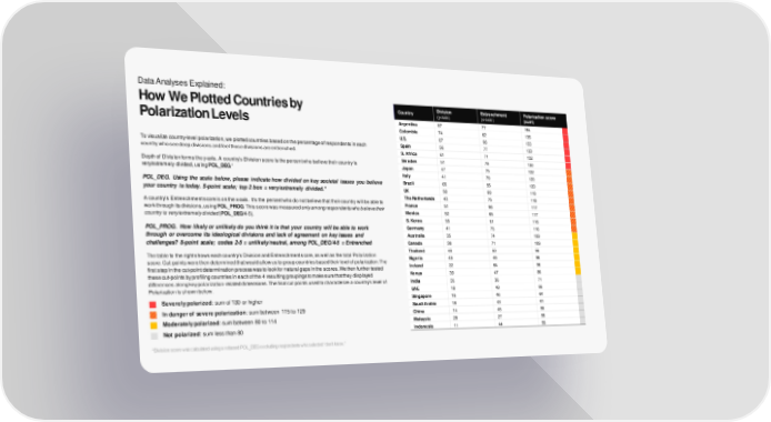 Data Analyses Explained: How We Plotted Countries by Country Division Entrenchment Polarization score (y-axis) (x-axis) (sum) Polarization Levels Argentina 87 77 164 Colombia 74 62 136 U.S. 67 66 133 To visualize country-level polarization, we plotted countries based on the percentage of respondents in each Spain 56 77 133 country who see deep divisions and feel those divisions are entrenched. S. Africa 61 71 132 Depth of Division forms the y-axis. A country’s Division score is the percent who believe their country is Sweden 51 79 130 very/extremely divided, using POL_DEG.* Japan 47 75 122 Italy 41 79 120 POL_DEG. Using the scale below, please indicate how divided on key societal issues you believe Brazil 65 55 120 your country is today. 5-point scale; top 2 box = very/extremely divided.* UK 50 69 119 A country’s Entrenchment score is on the x-axis. It’s the percent who do not believe that their country will be able to The Netherlands 43 75 118 work through its divisions, using POL_PROG. This scorewas measured only among respondents who believe their France 51 66 117 country is very/extremely divided (POL_DEG/4-5). Mexico 52 65 117 S. Korea 55 61 116 POL_PROG. How likely or unlikely do you think it is that your country will be able to work Germany 41 75 116 through or overcome its ideological divisions and lack of agreement on key issues and Australia 35 74 109 challenges? 8-point scale; codes 2-5 = unlikely/neutral, among POL_DEG/4-5 = Entrenched Canada 38 71 109 The tableto the right shows each country’s Division and Entrenchment score, as well as the total Polarization Thailand 48 50 98 score. Cut-points were then determined that would allow us to group countries based their level of polarization.The Nigeria 49 49 98 first step in the cut-point determination process was to look for natural gaps in the scores. We then further tested Ireland 32 64 96 these cut-points by profiling countries in each of the 4 resulting groupings to make sure that they displayed Kenya 39 47 86 differences along key polarization-related dimensions. The final cut points used to characterize a country’s level of India 35 36 71 Polarization is shown below. UAE 18 48 66 Severely polarized: sum of 130 or higher Singapore 18 46 64 In danger of severe polarization: sum between 115 to 129 Saudi Arabia 18 43 61 China 14 45 59 Moderately polarized: sum between 80 to 114 Malaysia 28 27 55 Not polarized: sum less than 80 Indonesia 11 44 55 *Division score was calculated using a rebased POL_DEG excluding respondents who selected “don’t know.”