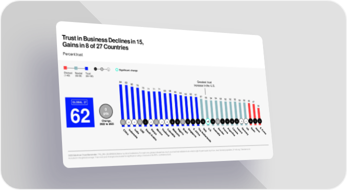 Trust in Business Declines in 15, Gains in 8 of 27 Countries Percent trust - 0 + Significant change Distrust Neutral Trust (1-49) (50-59) (60-100) Greatest trust 84 83 80 increase in the U.S. 78 73 71 71 71 68 68 66 64 62 62 61 57 55 54 54 53 52 52 52 50 50 49 47 GLOBAL 27 38 0 pts 62 Change, 0 +2 +1 0 -1 +1 0 +1 +5 -3 -2 0 -2 -1 -2 -2 +6 -4 n/a -1 -4 -2 -2 +2 +1 -2 -1 -5 2022 to 2023 2023 Edelman Trust Barometer. TRU_INS. [BUSINESS] Below is a list of institutions. For each one, please indicate how much you trust that institution to do what is right. 9-point scale; top 4 box, trust. General population, 27-mkt avg. *Sweden is not included in the global average. Year-over-year changes were tested for significance using a t-test set at the 99%+ confidence level.