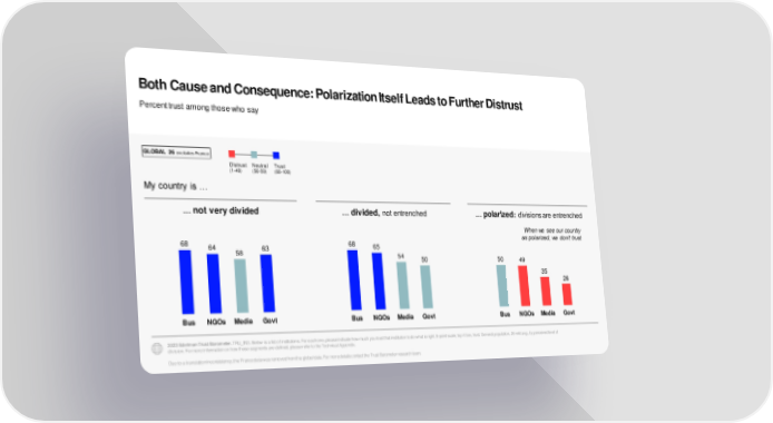 Both Cause and Consequence: Polarization Itself Leads to Further Distrust Percent trust among those who say GLOBAL 26 excludes France Distrust Neutral Trust (1-49) (50-59) (60-100) My country is … … not very divided … divided, not entrenched … polarized: divisions are entrenched When we see our country 68 68 as polarized, we don’t trust 64 58 63 65 54 50 50 49 35 26 Bus NGOs Media Govt Bus NGOs Media Govt Bus NGOs Media Govt 2023 Edelman Trust Barometer. TRU_INS. Below is a list of institutions. For each one, please indicate how much you trust that institution to do what is right.9-point scale; top 4 box, trust. General population, 26-mkt avg., by perceived level of division. For more information on how these segments are defined, please refer to the Technical Appendix. Due to a translation inconsistency, the France data was removed from the global data. For more details contact the Trust Barometer research team.