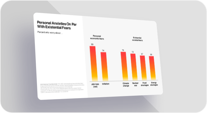 Personal Anxieties On Par With Existential Fears Percent who worry about … Personal Existential economic fears societalfears 89 74 76 72 67 66 2023 Edelman Trust Barometer. POP_EMO. Some people say they worry about many Job loss Inflation Climate Nuclear Food Energy things while others say they have few concerns. We are interested in what you worry about. Specifically, how much do you worry about each of the following? (net) change war shortages shortages 9-point scale; top 4 box, worry. Some attributes asked of half of the sample. General population, 27-mkt avg. Job loss asked of those who are an employee of an organization (Q43/1). Job loss is a net of attributes 1-3, 5, and 22-24.