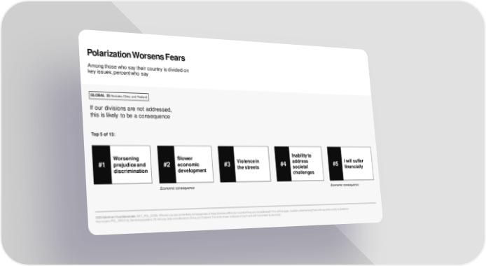 Polarization Worsens Fears Among those who say their country is divided on key issues, percent who say GLOBAL 25 Excludes China and Thailand If our divisions are not addressed, this is likely to be a consequence Top 5 of 13: Worsening Slower Inability to #1 prejudice and #2 economic #3 Violence in #4 address #5 I will suffer discrimination development the streets societal financially challenges Economic consequence Economic consequence 2023 Edelman Trust Barometer. NAT_POL_CONS. What do you see as the likely consequences of these divisions within your country if they are not addressed? Pick all that apply. Question asked among those who say their country is divided on key issues (POL_DEG/2-5). General population, 25-mkt avg. Data not collected in China and Thailand. The order shown is based on top 5 rank with ties broken by decimals.