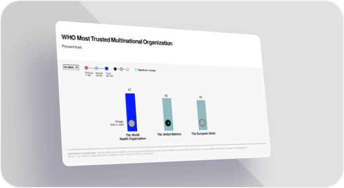 WHO Most Trusted Multinational Organization Percent trust GLOBAL 27 - 0 + Significant change Distrust Neutral Trust (1-49) (50-59) (60-100) 67 59 56 Change, 2022 to 2023 0 -3 0 The World The United Nations The European Union Health Organization 2023 Edelman Trust Barometer. TRU_INS. Below is a list of institutions. For each one, please indicate how much you trust that institution to do what is right. 9-point scale; top 4 box, trust. Attributes asked of half of the sample. General population, 27- mkt avg. Year-over-year changes were tested for significance using a t-test set at the 99%+ confidence level.