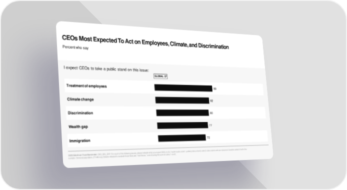 CEOs Most Expected To Act on Employees, Climate, and Discrimination Percent who say I expect CEOs to take a public stand on this issue: GLOBAL 27 Treatment of employees 89 Climate change 82 Discrimination 80 Wealth gap 77 Immigration 72 2023 Edelman Trust Barometer. CEO_ISS_EXP. For each of the following issues, please indicate what you expect CEOs to do. 3-point scale; code 1, publicly take a stand; code 2, take a stand and use resources. Question asked of half of the sample. General population, 27-mkt avg. Data is rebased to exclude those that said, “don’t know,” and showing the sum of codes 1 and 2.