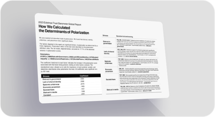 2023 Edelman Trust Barometer Global Report How We Calculated the Determinants of Polarization Drivers Question text and scoring We also wanted to know what leads to polarization. We found that distrust, identity, TRU_INS. [GOVERNMENT] Below is a list of institutions. For each one, please unfairness, and pessimism were significant drivers. Distrust in indicate how much you trust that institution to do what is right using a 9-point government scale where one means that you “do not trust them at all” and nine means that you “trust them a great deal”.9-point scale; bottom 4 box = distrust in The factors depicted in the report are significant drivers of polarization as determined by a government linear regression. Polarization refers to the 3-pt scale described on the polarization SOC_FAB_STR. How true is each of the following statements regarding the definition slide. The full model, depicted below, accounts for 17.71% of the observed Lack of shared current situation in your country? For each one, please rate how true you believe variance in polarization scores. identity that statement is using a nine-point scale where one means it is “not at all true” Polarization= and nine means it is “completely true”. 9-point scale; (r1,3,6,7), average score between 1-5 = lack of shared identity (0.2351)+(.3380)DistrustInGovernment+(.3068)LackOfSharedIdentity+(.2478)SystemI nequality +(.1465)EconomicPessimism+(.1431)SocietalFears+(.1062)DistrustInMedia POP_MDC. Below is a list of statements. For each one, please rate how true you Systemic believe that statement is using a nine-point scale where one means it is “not at all The coefficient listed next to each factor indicates the increase in the polarization score unfairness true” and nine means it is “completely true”. 9-point scale; (r2,3,18*,19*), average associated with that factor being present, holding all other factors constant. This score of 6 or greater = systemic unfairness *reverse scored standardized value allowed us to rank the importance of each predictor variable and determine what factors drive polarization the most. All coefficients were significant at a Economic CNG_FUT. Thinking about the economic prospects for yourself and your family, p<.001 level. pessimism how do you think you and your family will be doing in five years’ time? Select one response. 5-point scale, codes 4,5 = economic pessimism Drivers Coefficient POP_EMO. Some people say they worry about many things while others say Distrust in government .3380 they have few concerns. We are interested in what you worry about. Specifically, Societal fears how much do you worry about each of the following? Please indicate your answer Lack of shared identity .3068 using a nine-point scale where one means “I do not worry about this at all” and Systemic unfairness .2478 nine means “I am extremely worried about this”. 9-point scale; top 4 box at a majority of items (r14, 27, 43, 30, 31, 32, 33) = societal fears Economic pessimism .1465 TRU_INS. [MEDIA] Below is a list of institutions. For each one, please indicate Societal fears .1431 Distrust in media how much you trust that institution to do what is right using a 9-point scale where Distrust in media .1062 one means that you “do not trust them at all” and nine means that you “trust them Constant .2351 a great deal”. 9-point scale; bottom 4 box = distrust in media