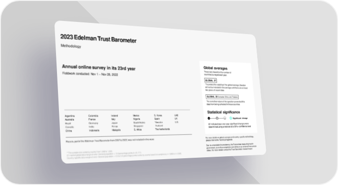 2023 Edelman Trust Barometer Methodology Global averages Annual online survey in its 23rd year These vary based on the number of countries surveyed each year: Fieldwork conducted: Nov 1 – Nov 28, 2022 GLOBAL 27 *To protect the stability of the global average, Sweden will not be included in the average until there are at least two years of recent data GLOBAL 25 Excludes China and Thailand The sensitive nature of the question prevented this data from being collected in these countries Statistical significance Argentina Colombia Ireland Mexico S. Korea UAE Australia France Italy Nigeria Spain UK - 0 + Significant change Brazil Germany Japan Saudi Arabia *Sweden U.S. Canada India Kenya Singapore Thailand All indicated year-over-year significant changes were China Indonesia Malaysia S. Africa The Netherlands determined using a t-test set at a 99%+ confidence level Russia, part of the Edelman Trust Barometer from 2007 to 2022, was not included in this wave For more details on global averages and country-specific methodology, please refer to the Technical Appendix Due to a translation inconsistency, the France data measuring trust in **The sample size varies by country from 1,082 to 1,500. government, as well as competence and ethics was removed from certain 27-market global data margin of error: General population +/-0.6 percentage points (n=31,171) slides. For more details contact the Trust Barometer research team Country-specific data margin of error: General population +/-2.5 to 3.0 percentage points (varies by country based on sample size, n=1,082 to n=1,500)
