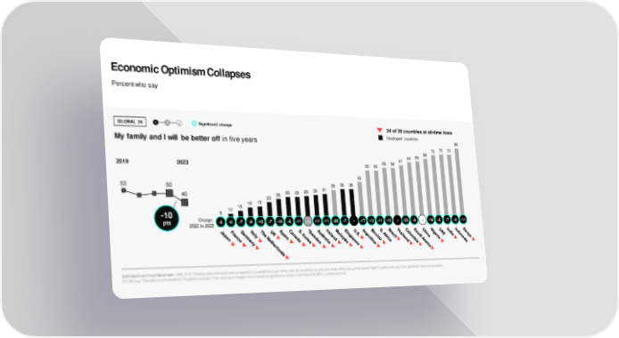 Economic Optimism Collapses Percent who say GLOBAL 24 - 0 + Significant change 24 of 28 countries at all-time lows Developed countries My family and I will be better off in five years 80 72 73 73 64 65 68 2019 2023 58 58 61 55 55 43 53 50 35 36 36 40 28 28 29 30 31 23 26 15 18 19 12 -10 9 pts Change, -6 -6 -7 -9 -10 -7 -10 -6 -11 n/a -11 -11 -20 -7 -4 -17 -13 -11 -15 -2 -22 -9 +1 -19 -6 -7 -8 -11 2022 to 2023 l l 2023 Edelman Trust Barometer. CNG_FUT. Thinking about the economic prospects for yourself and your family, how do you think you and your family will be doing in five years’ time? 5-point scale; top 2 box, better off. General population, 24-mkt avg. *Sweden is not included in the global average. Year-over-year changes were tested for significance using a t-test set at the 99%+ confidence level.