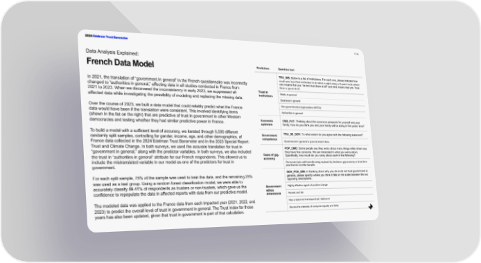 2024 Edelman Trust Barometer P. 65 Data Analysis Explained: French Data Model Predictors Question text TRU_INS: Below is a list of institutions. For each one, please indicate how much you trust that institution to do what is right using a 9-point scale where In 2021, the translation of “government in general” in the French questionnaire was incorrectly one means that you “do not trust them at all” and nine means that you “trust changed to “authorities in general,” affecting data in all studies conducted in France from them a great deal”. 2021 to 2023. When we discovered the inconsistency in early 2023, we suppressed all Trust in Media in general affected data while investigating the possibility of modeling and replacing the missing data. institutions Business in general Over the course of 2023, we built a data model that could reliably predict what the France Non-governmental organizations (NGOs) data would have been if the translation were consistent. This involved identifying items Authorities in general (shown in the list on the right) that are predictive of trust in government in other Western Economic CNG_FUT: Thinking about the economic prospects for yourself and your democracies and testing whether they had similar predictive power in France. optimism family, how do you think you and your family will be doing in five years’ time? To build a model with a sufficient level of accuracy, we iterated through 5,000 different Government TRU_3D_GOV: To what extent do you agree with the following statement? randomly split samples, controlling for gender, income, age, and other demographics, of competence France data collected in the 2024 Edelman Trust Barometer and in the 2023 Special Report: Government in general is good at what it does Trust and Climate Change. In both surveys, we used the accurate translation for trust in POP_EMO: Some people say they worry about many things while others say “government in general,” along with the predictor variables. In both surveys, we also included Fears of gig- they have few concerns. We are interested in what you worry about. the trust in “authorities in general” attribute for our French respondents. This allowed us to Specifically, how much do you worry about each of the following? include the mistranslated variable in our model as one of the predictors for trust in economy Permanent jobs with benefits being replaced by freelance, gig-economy or short-term government. jobs that do not offer benefits GOV_PER_DIM: In thinking about why you do or do not trust government in For each split sample, 75% of the sample was used to train the data, and the remaining 25% general, please specify where you think it falls on the scale between the two was used as a test group. Using a random forest classification model, we were able to opposing descriptions. accurately classify 89.41% of respondents as trusters or non-trusters, which gave us the Government Highly effective agent of positive change confidence to repopulate the data in affected reports with data from our predictive model. ethics Honest and fair dimensions The modeled data was applied to the France data from each impacted year (2021, 2022, and Has a vision for the future that I believe in 2023) to predict the overall level of trust in government in general. The Trust Index for those Serves the interests of everyone equally and fairly years has also been updated, given that trust in government is part of that calculation.