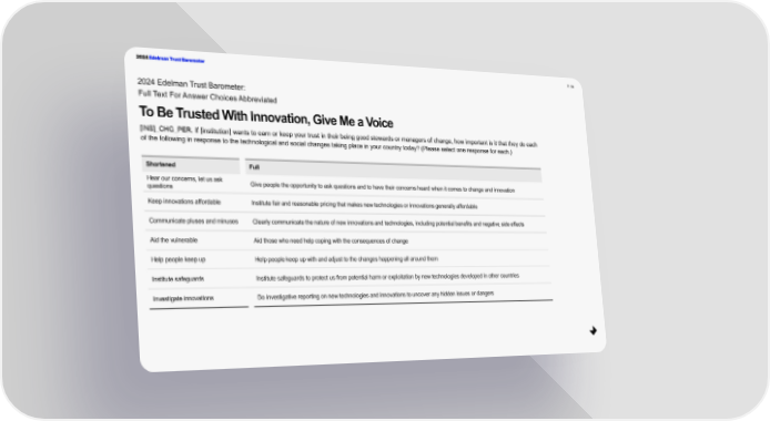 2024 Edelman Trust Barometer P. 84 2024 Edelman Trust Barometer: Full Text For Answer Choices Abbreviated To Be Trusted With Innovation, Give Me a Voice [INS]_CHG_PER. If [institution] wants to earn or keep your trust in their being good stewards or managers of change, how important is it that they do each of the following in response to the technological and social changes taking place in your country today? (Please select one response for each.) Shortened Full Hear our concerns, let us ask Give people the opportunity to ask questions and to have their concerns heard when it comes to change and innovation questions Keep innovations affordable Institute fair and reasonable pricing that makes new technologies or innovations generally affordable Communicate pluses and minuses Clearly communicate the nature of new innovations and technologies, including potential benefits and negative side effects Aid the vulnerable Aid those who need help coping with the consequences of change Help people keep up Help people keep up with and adjust to the changes happening all around them Institute safeguards Institute safeguards to protect us from potential harm or exploitation by new technologies developed in other countries Investigate innovations Do investigative reporting on new technologies and innovations to uncover any hidden issues or dangers