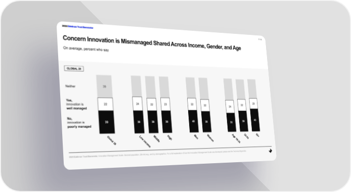 2024 Edelman Trust Barometer P. 19 Concern Innovation is Mismanaged Shared Across Income, Gender, and Age On average, percent who say GLOBAL 28 Neither 39 Yes, 24 22 20 innovation is 22 22 23 22 24 22 well managed No, 4343 innovation is 39 3939 3939 3939 4040 3838 3535 3939 poorly managed GloGlo LoLo MiMi HiHi MeMe WoWo AgAg 35-35- 55+55+ bb ww dd gg nn mm ee 5454 aa dd hh l 2l 2 ii ncnc llee ee 11 nn 88 88 omom --33 ee 44 2024 Edelman Trust Barometer. Innovation Management Scale. General population, 28-mkt avg., and by demographics. For a full explanation of how the Innovation Management Scale was developed, please see the Technical Appendix.