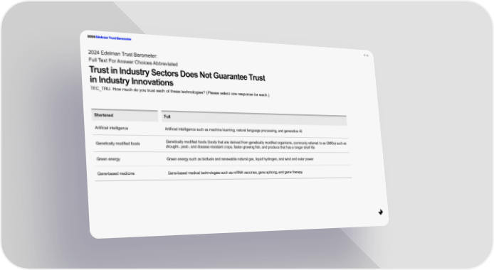 2024 Edelman Trust Barometer P. 73 2024 Edelman Trust Barometer: Full Text For Answer Choices Abbreviated Trust in Industry Sectors Does Not Guarantee Trust in Industry Innovations TEC_TRU. How much do you trust each of these technologies? (Please select one response for each.) Shortened Full Artificial intelligence Artificial intelligence such as machine learning, natural language processing, and generative AI Genetically modified foods Genetically modified foods (foods that are derived from genetically modified organisms, commonly referred to as GMOs) such as drought-, pest-, and disease-resistant crops, faster-growing fish, and produce that has a longer shelf life Green energy Green energy such as biofuels and renewable natural gas, liquid hydrogen, and wind and solar power Gene-based medicine Gene-based medical technologies such as mRNA vaccines, gene splicing, and gene therapy