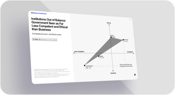 2024 Edelman Trust Barometer P. 7 Institutions Out of Balance: Ethical Government Seen as Far Less Competent and Ethical than Business (Competence score, net ethical score) NGOs (1, 20) Business GLOBAL 25 Excludes China, S. Korea, Thailand (17, 17) Less competent Competent Media (-17, -4) Government Government 52 pts less (-35, -15) competent than business 2024 Edelman Trust Barometer. The ethical scores are averages of nets based on [INS]_PER_DIM/1-4. Media and NGOs were only asked of half the sample. The competence score is a net based on TRU_3D_[INS]/1. Media and NGOs were only asked of half the sample. General population, 25-mkt avg. Data not collected in China and Thailand; Due to a translation inconsistency in S. Korea, Unethical it has been excluded from this analysis. For full details regarding how this data was calculated and plotted, please see the Technical Appendix.