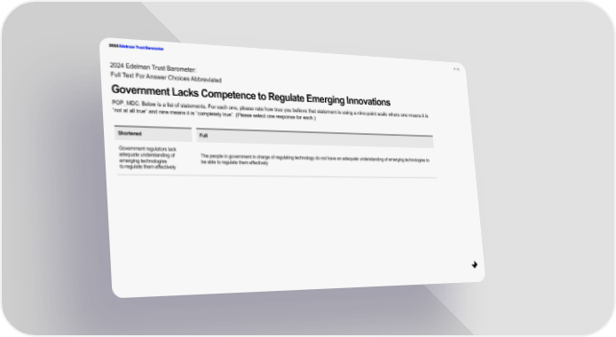 2024 Edelman Trust Barometer P. 75 2024 Edelman Trust Barometer: Full Text For Answer Choices Abbreviated Government Lacks Competence to Regulate Emerging Innovations POP_MDC. Below is a list of statements. For each one, please rate how true you believe that statement is using a nine-point scale where one means it is “not at all true” and nine means it is “completely true”. (Please select one response for each.) Shortened Full Government regulators lack adequate understanding of The people in government in charge of regulating technology do not have an adequate understanding of emerging technologies to emerging technologies be able to regulate them effectively to regulate them effectively