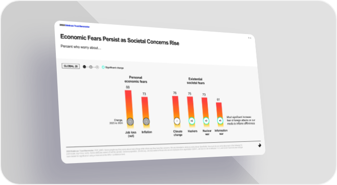 2024 Edelman Trust Barometer P. 11 Economic Fears Persist as Societal Concerns Rise Percent who worry about… GLOBAL 28 - 0 + Significant change Personal Existential economic fears societal fears 88 73 76 75 73 61 Change, Most significant increase: 2023 to 2024 0 0 +1 +5 +2 +6 fear of foreign attacks on our media to inflame differences Job loss Inflation Climate Hackers Nuclear Information (net) change war war 2024 Edelman Trust Barometer.POP_EMO. Some people say they worry about many things while others say they have few concerns. We are interested in what you worry about. Specifically, how much do you worry about each of the following? 9- point scale; top 4 box, worry. Some attributes asked of half the sample. General population, 28-mkt avg. Job loss asked of those who are an employee of an organization (Q43/1). Job loss is a net of attributes 1-3, 5, and 22-24.Year-over-year changes were tested for significance using a t-test set at the 99%+ confidence level.