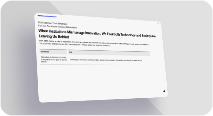 2024 Edelman Trust Barometer P. 79 2024 Edelman Trust Barometer: Full Text For Answer Choices Abbreviated When Institutions Mismanage Innovation, We Feel Both Technology and Society Are Leaving Us Behind POP_MDC. Below is a list of statements. For each one, please rate how true you believe that statement is using a nine-point scale where one means it is “not at all true” and nine means it is “completely true”. (Please select one response for each.) Shortened Full Technology is changing too quickly, in ways that are not good for people Technological innovations are happening too quickly and are leading to changes that are not good for people like me like me
