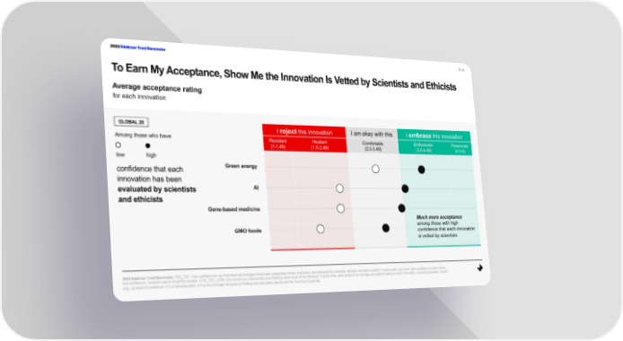 2024 Edelman Trust Barometer P. 27 To Earn My Acceptance, Show Me the Innovation Is Vetted by Scientists and Ethicists Average acceptance rating for each innovation GLOBAL 28 I reject this innovation I am okay with this I embracethis innovation Among those who have Resistant Hesitant Comfortable Enthusiastic Passionate (1-1.49) (1.5-2.49) (2.5-3.49) (3.5-4.49) (4.5-5) low high confidence that each Green energy innovation has been evaluated by scientists AI and ethicists Gene-based medicine Much more acceptance GMO foods among those with high confidence that each innovation is vetted by scientists 2024 Edelman Trust Barometer.TEC_TST. How confident are you that these technologies have been adequately tested, evaluated, and assessed by scientists, ethicists, and other experts? 5-point scale; top 2 box, high confidence; bottom 2 box, low confidence. Question asked of half the sample. CHG_TEC_COM. How would you characterize your feelings about each of the following? 5-point scale; data plotted is an average acceptance rating for each innovation. General population, 28-mkt avg., by level of confidence. For a full explanation of how the Average Acceptance Rating was calculated, please see the Technical Appendix.