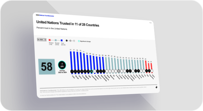 2024 Edelman Trust Barometer P. 49 United Nations Trusted in 11 of 28 Countries Percent trust in the United Nations GLOBAL 28 - 0 + Significant change Distrust Neutral Trust (1-49) (50-59) (60-100) 77 77 76 75 71 66 65 63 61 60 60 59 59 57 56 54 53 52 52 51 51 50 50 50 50 48 38 38 -1 58 pts Change, -1 -1 -4 -4 -1 -3 -14 +5 -6 -1 -5 +1 +3 +3 +3 0 +1 +2 -6 -6 +2 -2 -8 +3 +1 -5 -5 +3 2023 to 2024 In Ke Ch Tha Ni UAE In Sw Me Ne Si B Ma UK S. Ca S. Au Sa Co Fr Ge Ir Sp U. It Ar Ja d g d n ra a e S a g p n i t K n A s u l r la a l ia n i e o e x h g zi la d o nc m i . y e an y l n d i o a f t n n a a a ri e c e a l y r d r ra i m a n a e o r p s i e d nd e a c A b t s n l o i l n i ia an r a a a ia r ia y n ds e ab a i a 2024 Edelman Trust Barometer.TRU_INS. Below is a list of institutions. For each one, please indicate how much you trust that institution to do what is right. 9-point scale; top 4 box, trust. Attribute asked of half the sample. General population, 28-mkt avg. Year-over-year changes were tested for significance using a t-test set at the 99%+ confidence level. In India, the Hindi translation for "The United Nations" was updated in 2024 to the formal reference.
