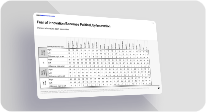 2024 Edelman Trust Barometer P. 55 Fear of Innovation Becomes Political, by Innovation Percent who reject each innovation s d 1 a a ia y a n a n i a n la n 2 i l b ca e l t a l d a d ysi r ia i r e a n r m ce n co e r r n d b e zi a n m a a ya a h e f i e . st n lo r i l y n l xi t A Ko a o g a a d l a e S Among those who lean… u r r e e . Gl Ar A B Ca Co F Ge In Ir Ita K M M Ne Nig S S. Sp Sw UK U. Right 18 10 28 12 25 11 21 37 15 14 15 10 9 10 20 14 15 13 18 20 20 40 n gy e e Left 10 7 7 9 6 11 13 10 17 12 9 6 17 14 10 19 15 10 8 8 6 6 Gr ener Difference, right vs left 8 3 21 3 19 0 8 27 -2 2 6 4 -8 -4 10 -5 0 3 10 12 14 34 Right 38 23 52 31 53 29 56 48 19 59 45 20 26 30 53 17 32 21 44 41 54 59 AI Left 42 40 52 30 53 32 58 51 22 53 39 22 25 29 57 25 31 22 43 46 57 51 Difference, right vs left -4 -17 0 1 0 -3 -2 -3 -3 6 6 -2 1 1 -4 -8 1 -1 1 -5 -3 8 - e Right 37 28 37 39 41 38 42 48 20 37 40 38 41 30 49 30 44 29 34 31 36 53 e d n ci n se i Left 30 31 22 20 22 32 39 36 21 33 21 43 47 31 39 33 46 24 26 31 29 23 a d Ge b e m Difference, right vs left 7 -3 15 19 19 6 3 12 -1 4 19 -5 -6 -1 10 -3 -2 5 8 0 7 30 O s Right 60 60 55 59 60 61 76 68 45 64 70 57 52 57 63 50 58 59 67 59 61 60 d GM o Left 61 65 48 57 55 67 81 63 38 59 64 70 67 64 66 49 69 60 64 62 59 48 fo Difference, right vs left -1 -5 7 2 5 -6 -5 5 7 5 6 -13 -15 -7 -3 1 -11 -1 3 -3 2 12 2024 Edelman Trust Barometer. CHG_TEC_COM. How would you characterize your feelings about each of the following? 5-point scale; bottom 2 box, resistant or hesitant = reject. General population, 21-mkt avg., by political leaning. Political leaning is not asked in China, Saudi Arabia, Thailand or the UAE. Indonesia, Japan, and Singapore are excluded from the analysis due to having sample sizes too low to report (less than n100).