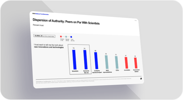 2024 Edelman Trust Barometer P. 10 Dispersion of Authority: Peers on Par With Scientists Percent trust GLOBAL 26 Excl China, Saudi Arabia Distrust Neutral Trust (1-49) (50-59) (60-100) I trust each to tell me the truth about new innovations and technologies 74 74 66 54 51 47 45 Scientists Someone Company NGO CEOs Journalists Government like me technical expert representatives leaders 2024 Edelman Trust Barometer.TRU_PEP_TCNG. Below is a list of categories of people. For each one, please indicate how much you trust that person or group of people to tell you the truth about new innovations and technologies. 9-point scale; top 4 box, trust. Question asked of half the sample. General population, 26-mkt avg. “Government leaders” not asked in China or Saudi Arabia.