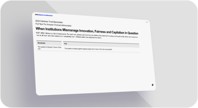 2024 Edelman Trust Barometer P. 80 2024 Edelman Trust Barometer: Full Text For Answer Choices Abbreviated When Institutions Mismanage Innovation, Fairness and Capitalism in Question POP_MDC. Below is a list of statements. For each one, please rate how true you believe that statement is using a nine-point scale where one means it is “not at all true” and nine means it is “completely true”. (Please select one response for each.) Shortened Full The system is biased in favor of the The system is biased against regular people and in favor of the rich and powerful rich
