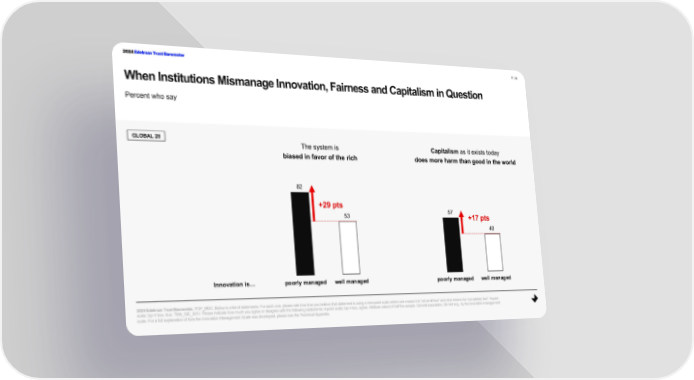2024 Edelman Trust Barometer P. 24 When Institutions Mismanage Innovation, Fairness and Capitalism in Question Percent who say GLOBAL 28 The system is Capitalism as it exists today biased in favor of the rich does more harm than good in the world 82 +29 pts 57 53 +17 pts 40 Innovation is… poorly managed well managed poorly managed well managed 2024 Edelman Trust Barometer. POP_MDC. Below is a list of statements. For each one, please rate how true you believe that statement is using a nine-point scale where one means it is “not at all true” and nine means it is “completely true”. 9-point scale; top 4 box, true. TMA_SIE_SHV. Please indicate how much you agree or disagree with the following statements. 9-point scale; top 4 box, agree. Attribute asked of half the sample. General population, 28-mkt avg., by the innovation management scale. For a full explanation of how the Innovation Management Scale was developed, please see the Technical Appendix.