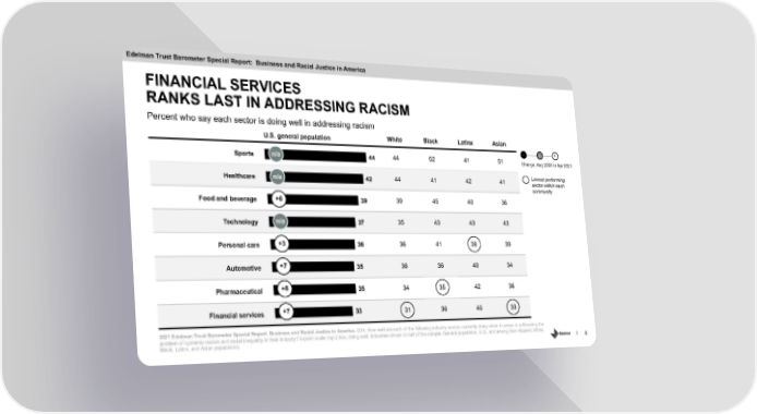 Edelman Trust Barometer Special Report: Business and Racial Justice in America FINANCIAL SERVICES RANKS LAST IN ADDRESSING RACISM Percent who say each sector is doing well in addressing racism U.S. general population White Black Latinx Asian - 0 + Sports n/a 44 44 52 41 51 Change, Aug 2020 to Apr 2021 Healthcare n/a 42 44 41 42 41 Lowest performing sector within each community Food and beverage +6 39 39 45 40 36 Technology n/a 37 35 43 43 43 Personal care +3 36 36 41 38 39 Automotive +7 35 36 36 40 34 Pharmaceutical +8 35 34 35 42 36 Financial services +7 33 31 36 40 33 2021 Edelman Trust Barometer Special Report: Business and Racial Justice in America. Q15. How well are each of the following industry sectors currently doing when it comes to addressing the problem of systemic racism and racial inequality in their industry? 6-point scale; top 2 box, doing well. Industries shown to half of the sample. General population, U.S., and among Non-Hispanic White, Black, Latinx, and Asian populations. 4